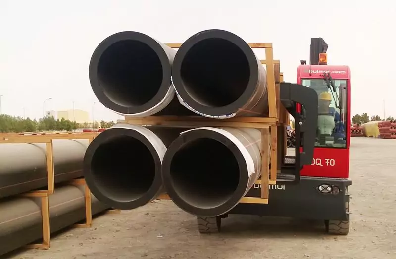 Hosszú csővezetékek szállítása oldalvillás targoncával – használatban Ománban.