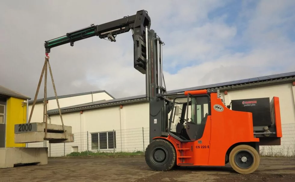 A csatlakoztatható darugém segítségével a gyorscsatlakozó rendszeren keresztül a legrövidebb idő alatt alakíthatja át MKF kompakt targoncáját teleszkópos daruval felszerelt járművé. Akár 5 tonnás teherbírás és kb. 10 méteres horogmagasság is elérhető.